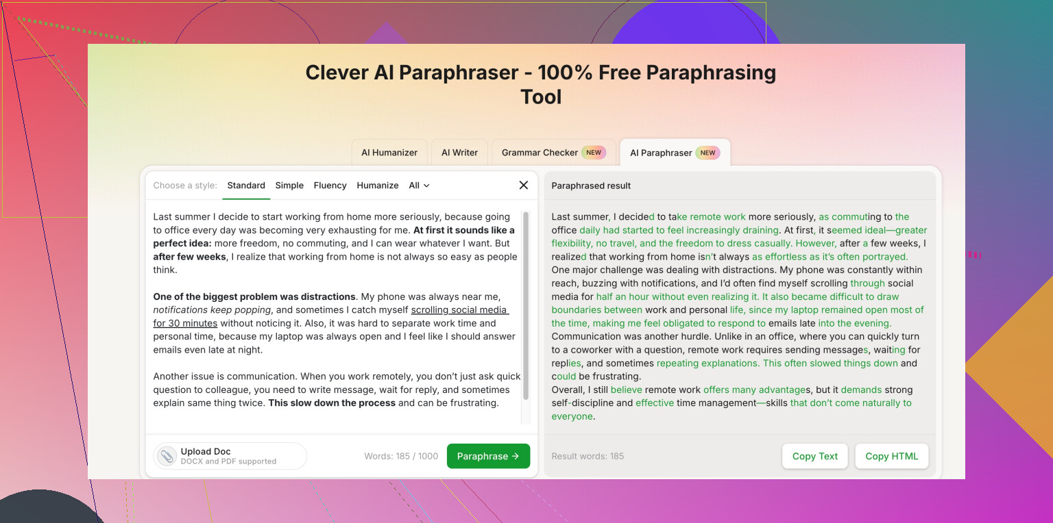 For AI flags, I’ve had better luck running text through a humanizer than trying to get a single paraphrase tool perfect.“Clever AI Humanizer” is one of the few that feels tuned for this.