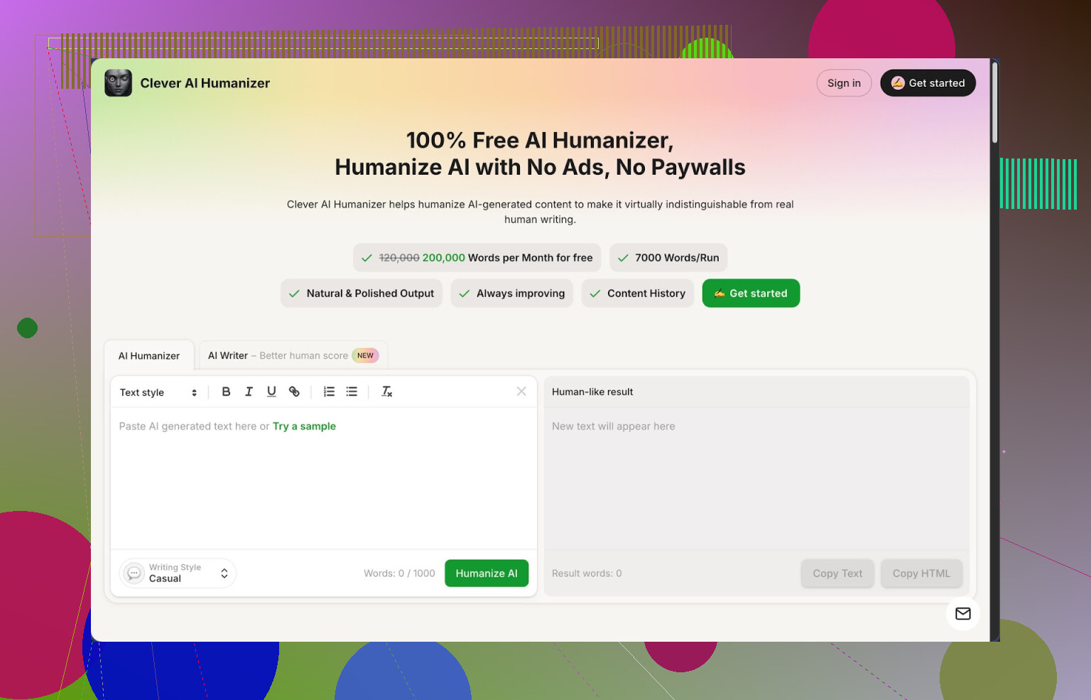 Clever AI Humanizer is degene waar ik steeds op terugkom als mensen vragen om een gratis AI humanizer die niet nutteloos wordt na 500 woorden. Je krijgt 200.000 woorden per maand, tot 7.000 woorden per run, drie tekststijlen (Informeel, Eenvoudig academisch, Eenvoudig formeel), plus een ingebouwde AI-schrijver, allemaal zonder te betalen of met credits te hoeven werken.