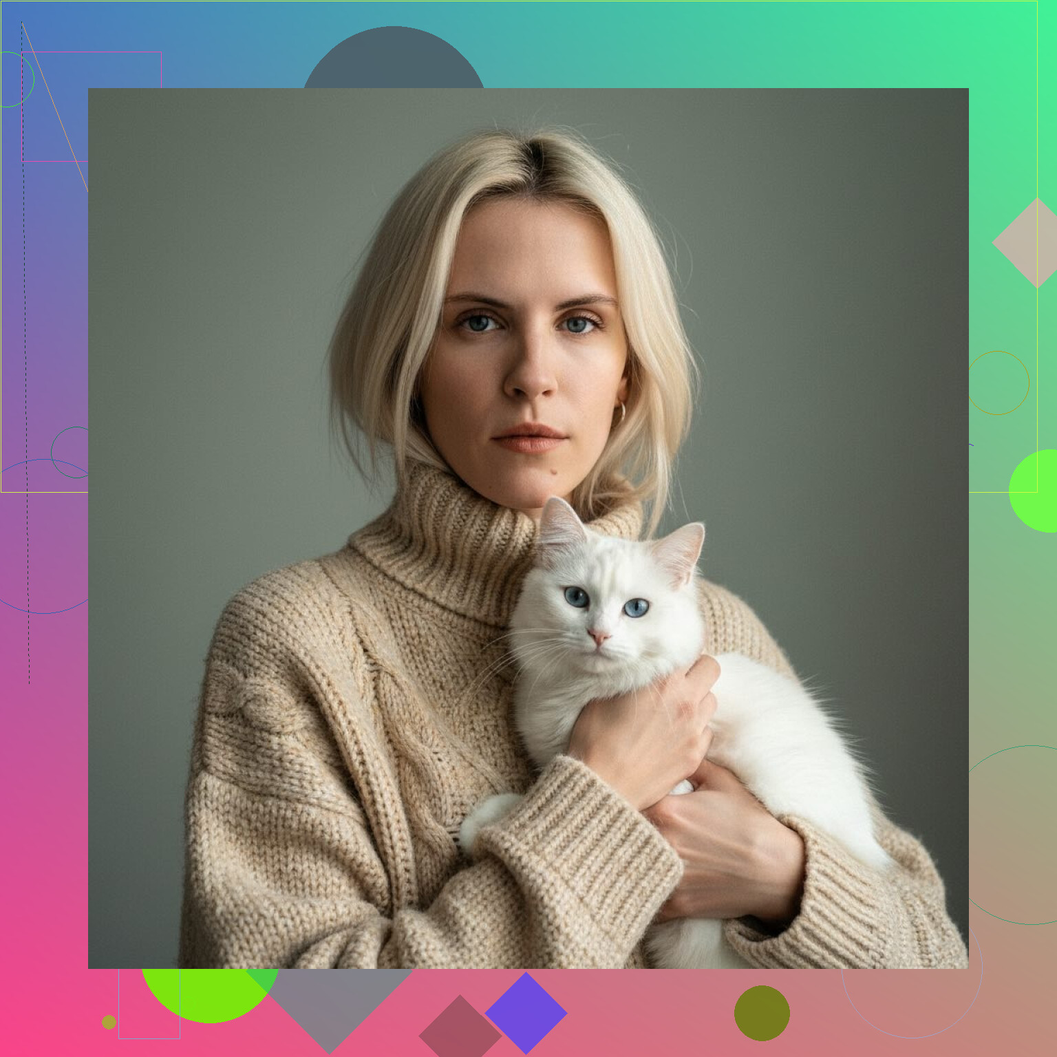 Example: “small orange cat sitting on the person’s left shoulder, same lighting, facing camera”.